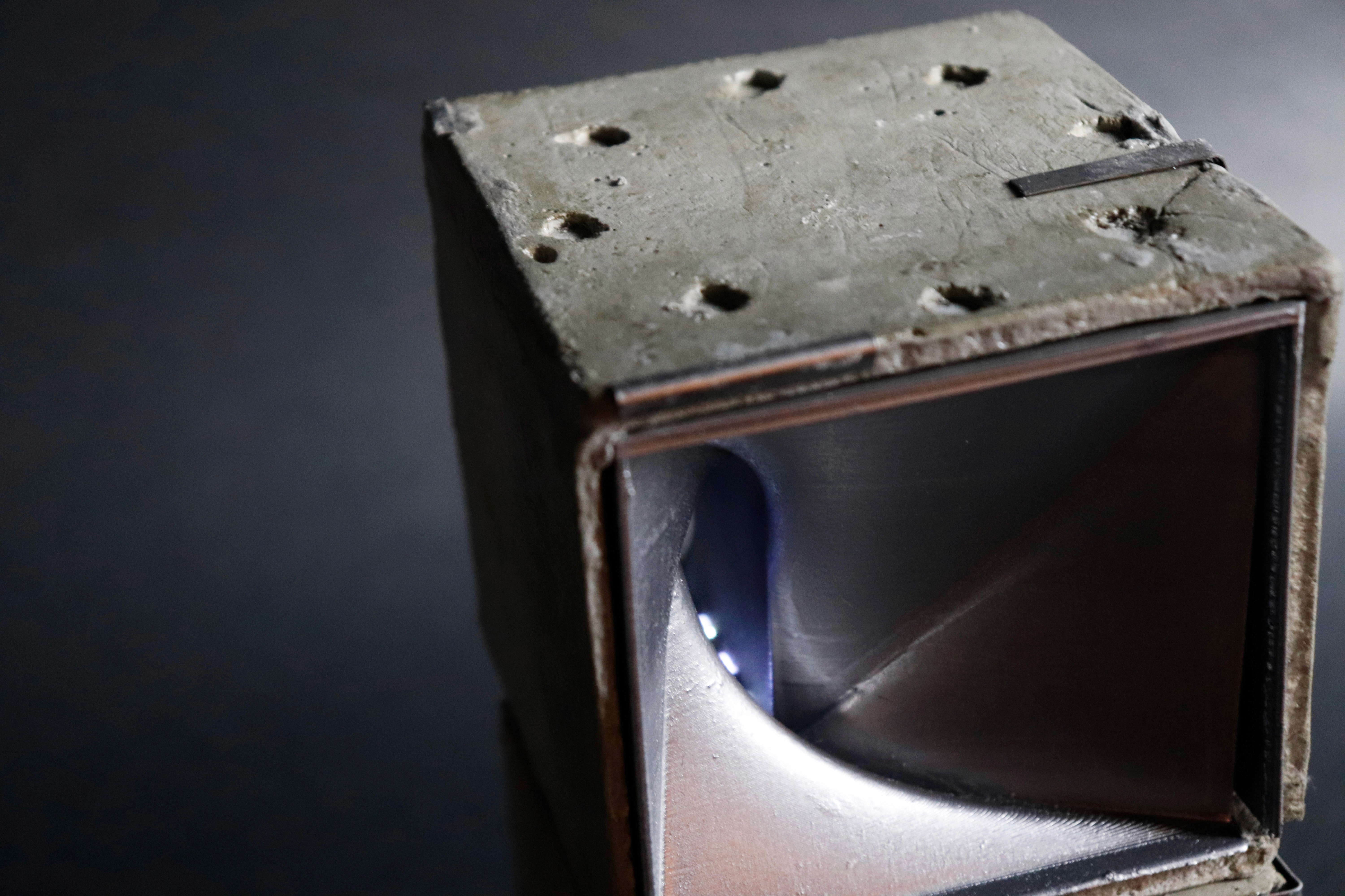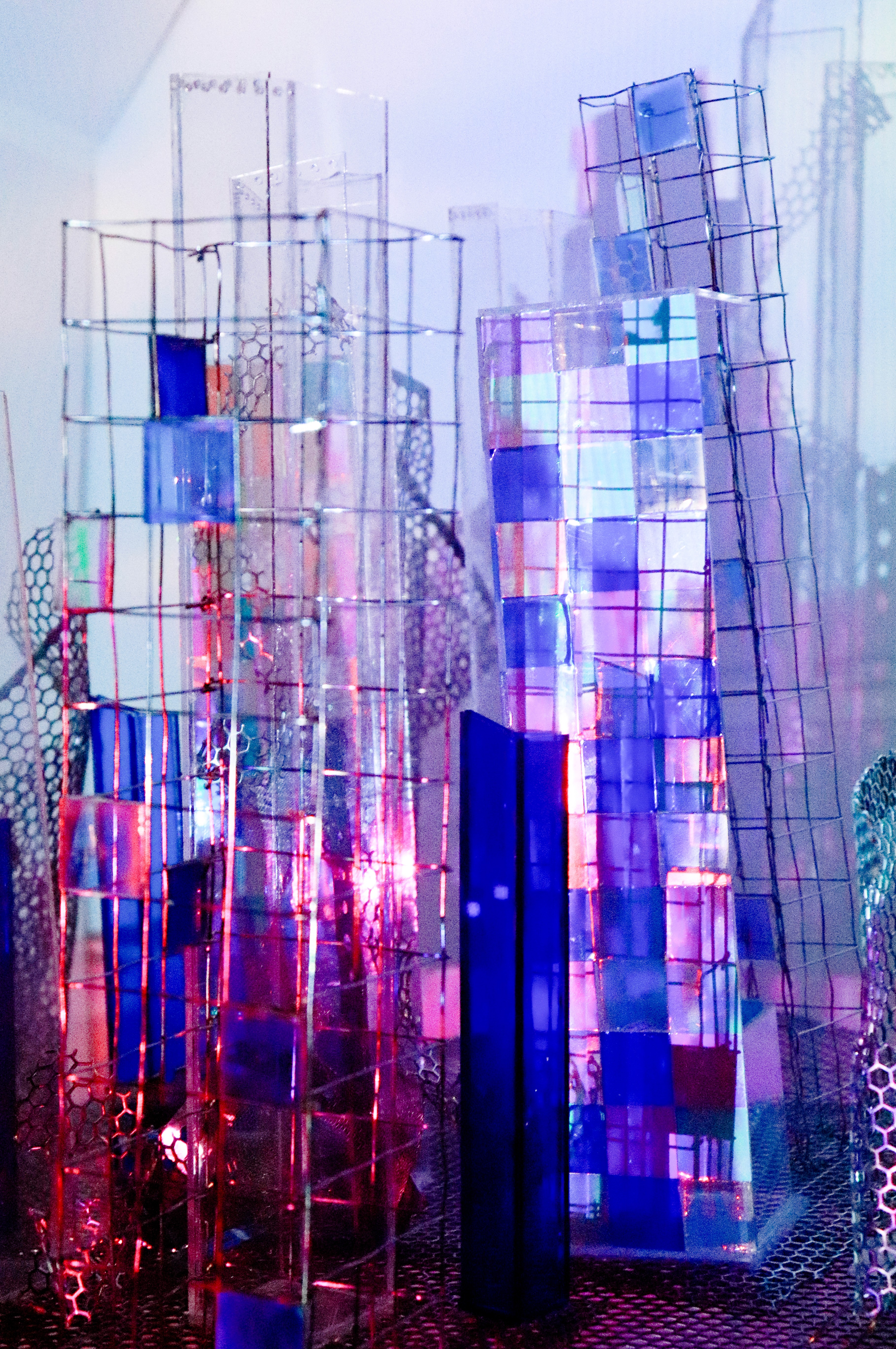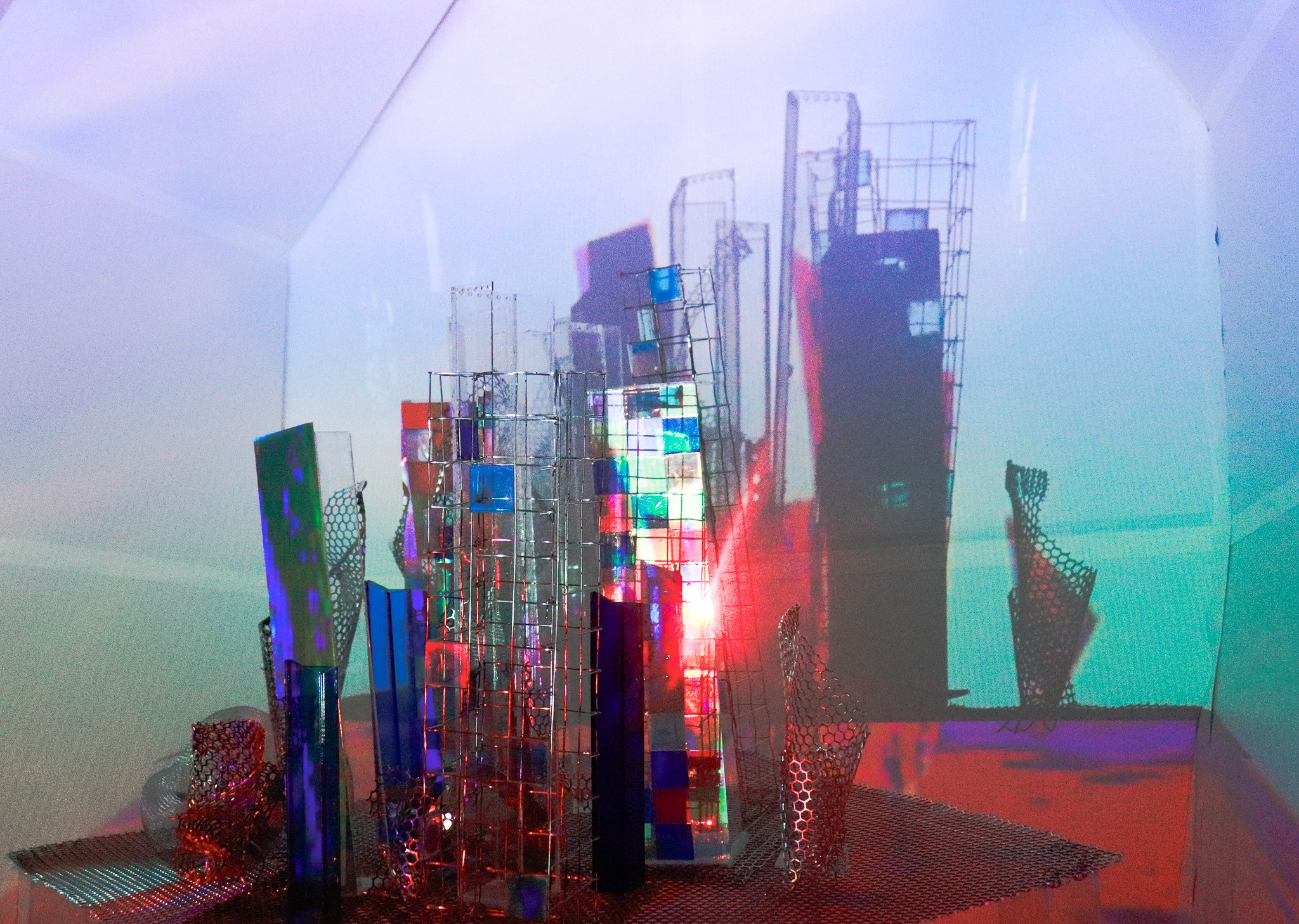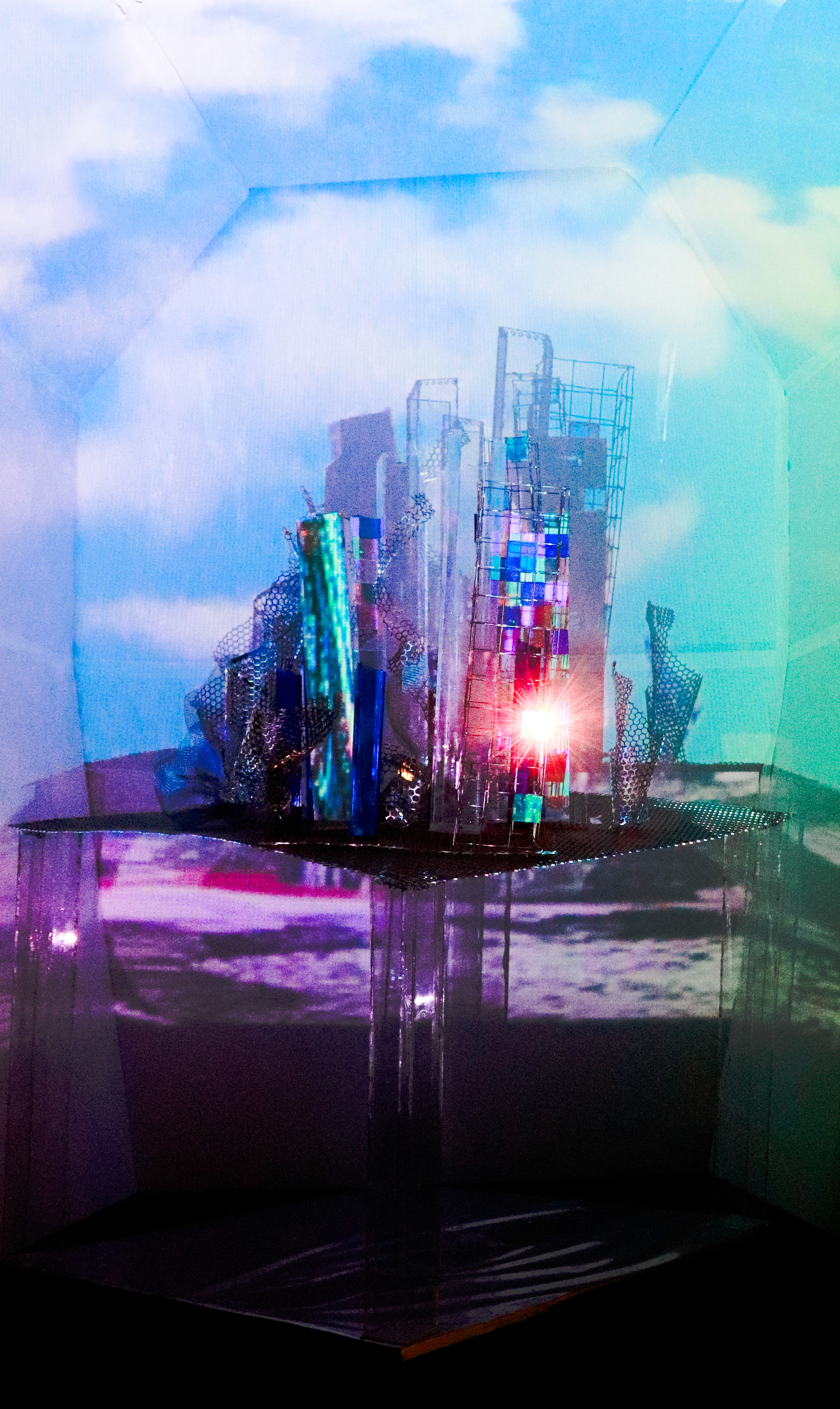 Castles in the Cloud offers the experience of approaching a city, capturing the moment of anticipation as the glittering lights of a skyline rise up to meet you. Squares of light and colour pepper the cityscape, emulating the pockets of different lives and realities held within. On careful examination, the artificial and constructed nature of the city is what enables its halo. Organic shapes are drawn with the curved brush of metal honeycombs, while lustrous vinyl winks at the towering metal and acrylic facades. Waves of colour and motion weave through the cityscape painted from projections of AI-generated and data-based artwork, emulating the dynamic swells and vibrant expectancy of its inhabitants renewing their commitment to their urban rituals.
