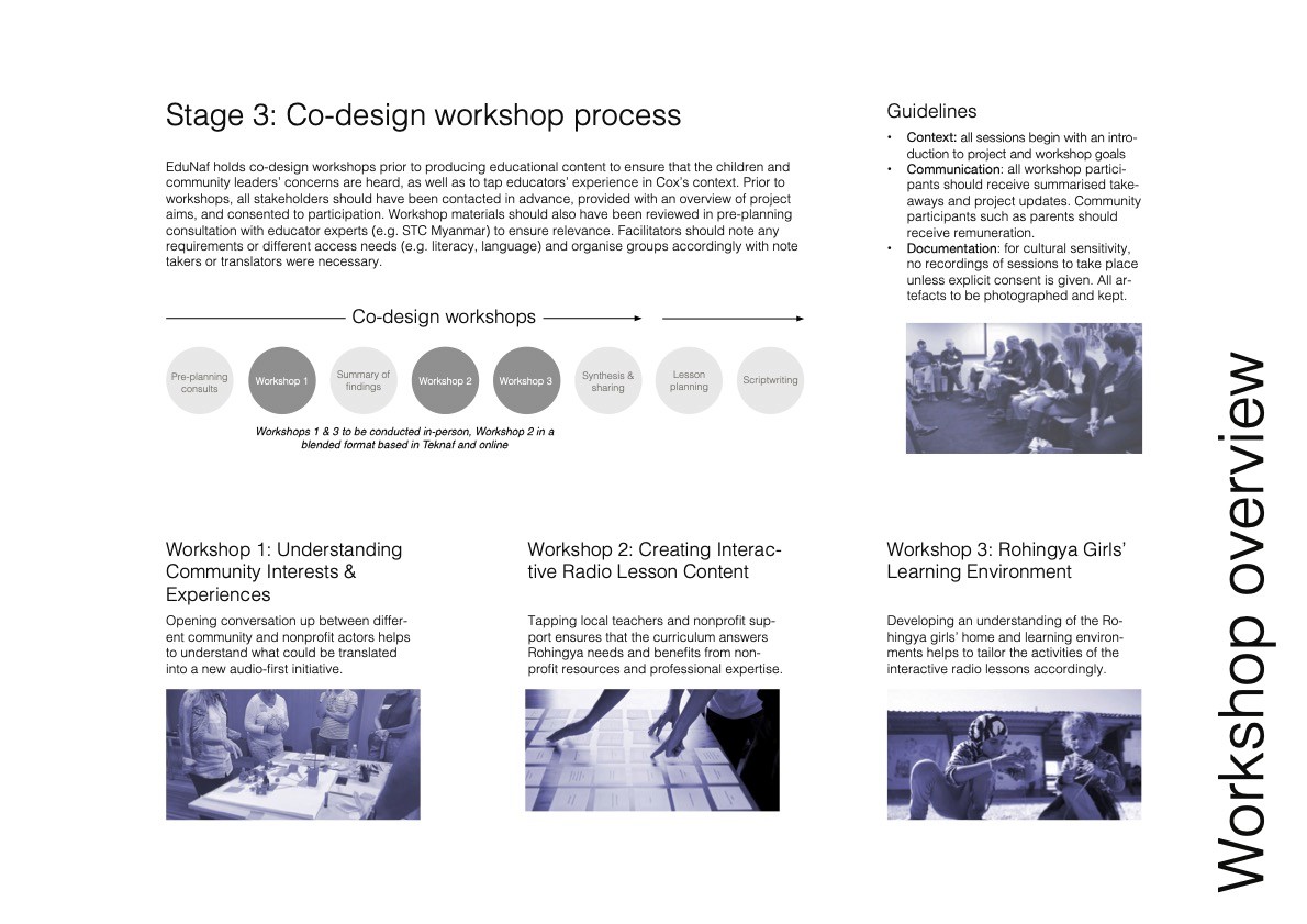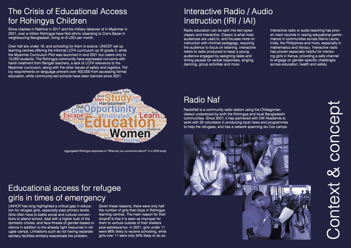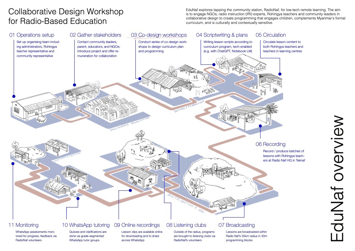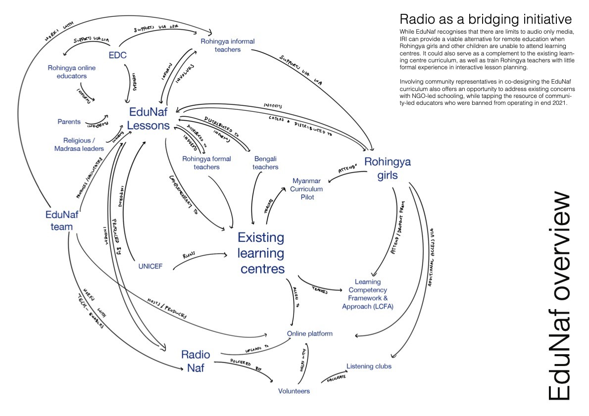 More than 50% of the Rohingya children in Cox’s lack access to education. Community-led schools were banned in 2021, NGO schooling reaches only the 2nd grade, and e-learning is hampered by limited internet. Rohingya girls especially are out of school due to a mix of resource, religious, and family reasons. EduNaf explores tapping the community station, RadioNaf, for low-tech remote learning. The aim is to engage NGOs, radio instruction (IRI) experts, Rohingya teachers and community leaders in collaborative design to create programming that engages children, complements Myanmar’s formal curriculum, and is culturally and contextually sensitive. The diagram above outlines the general flow of the initiative, while the images below provide more details, sample artefacts and stakeholders identified.