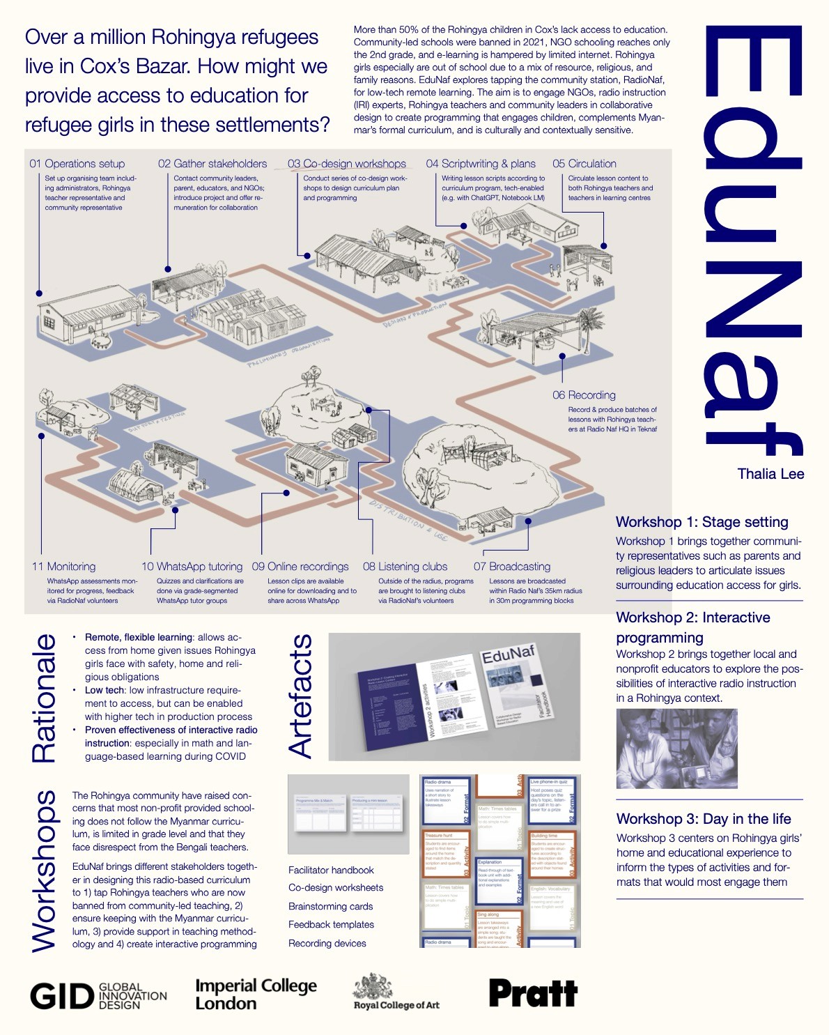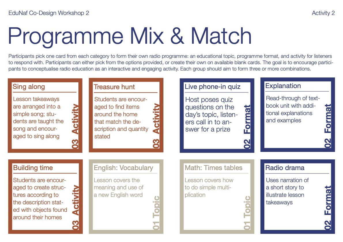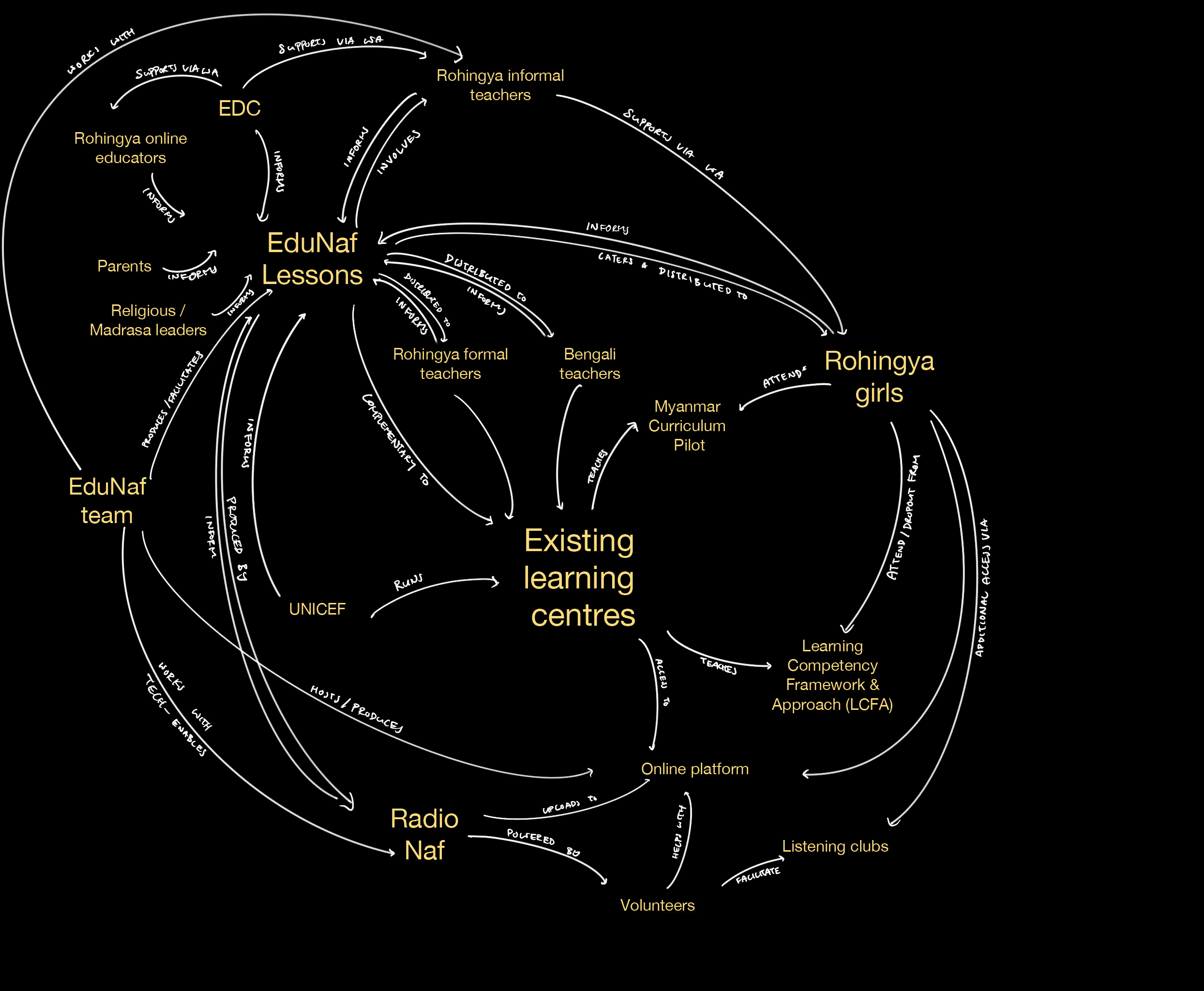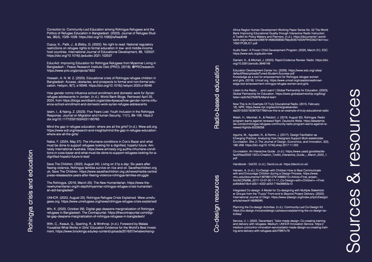 More than 50% of the Rohingya children in Cox’s lack access to education. Community-led schools were banned in 2021, NGO schooling reaches only the 2nd grade, and e-learning is hampered by limited internet. Rohingya girls especially are out of school due to a mix of resource, religious, and family reasons. EduNaf explores tapping the community station, RadioNaf, for low-tech remote learning. The aim is to engage NGOs, radio instruction (IRI) experts, Rohingya teachers and community leaders in collaborative design to create programming that engages children, complements Myanmar’s formal curriculum, and is culturally and contextually sensitive. The diagram above outlines the general flow of the initiative, while the images below provide more details, sample artefacts and stakeholders identified.