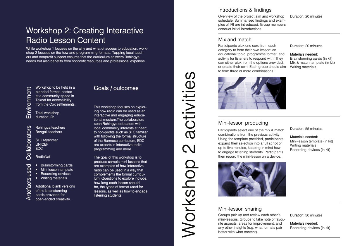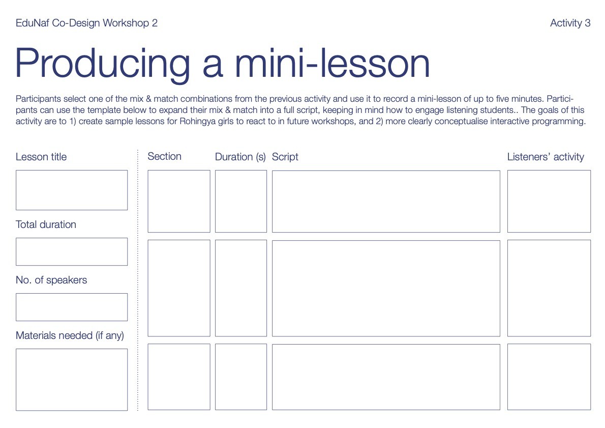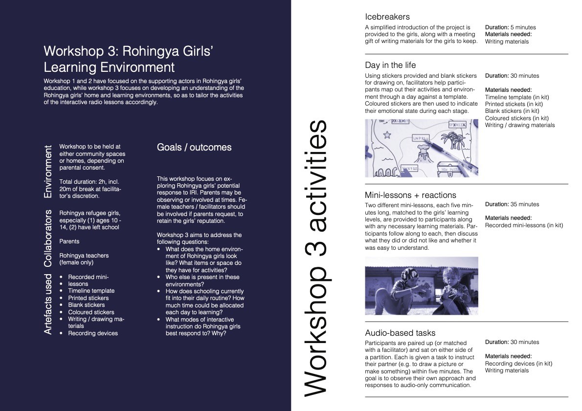This would follow in a series of three main workshops. Workshop 1 brings together community representatives such as parents and religious leaders to articulate issues surrounding education access for girls Workshop 2 brings together local and nonprofit educators to explore the possibilities of interactive radio instruction in a Rohingya context. Workshop 3 centers on Rohingya girls’ home and educational experience to inform the types of activities and formats that would most engage them.