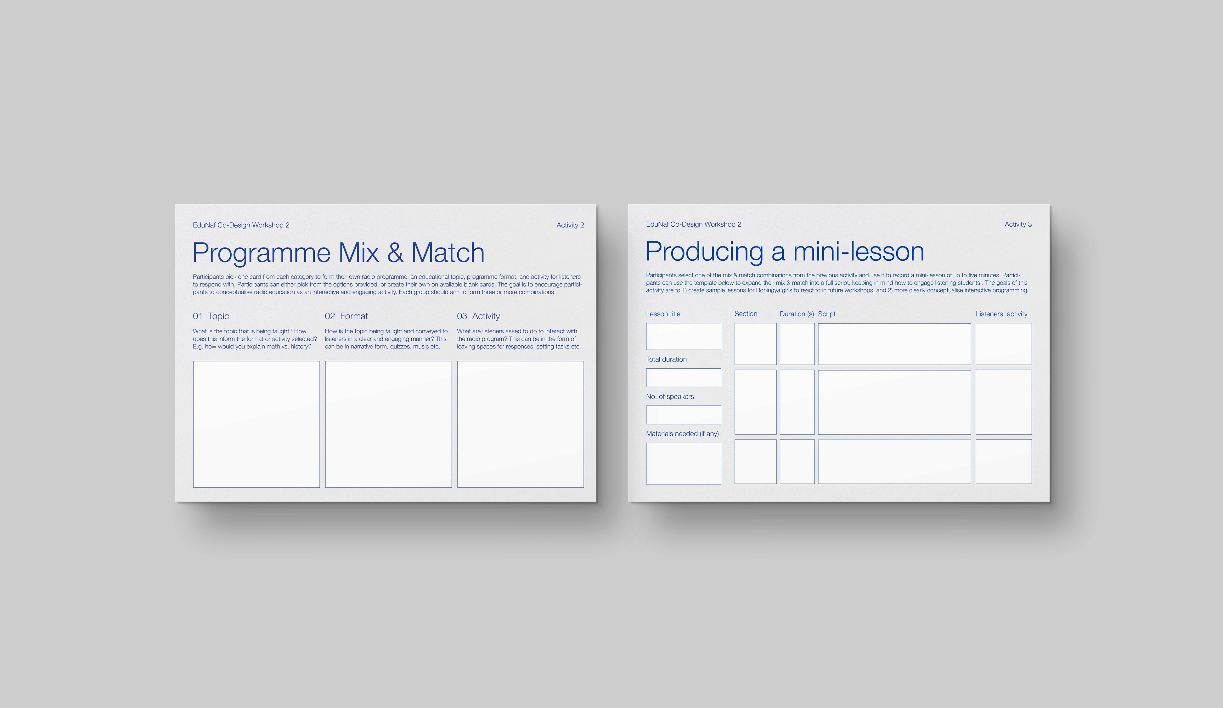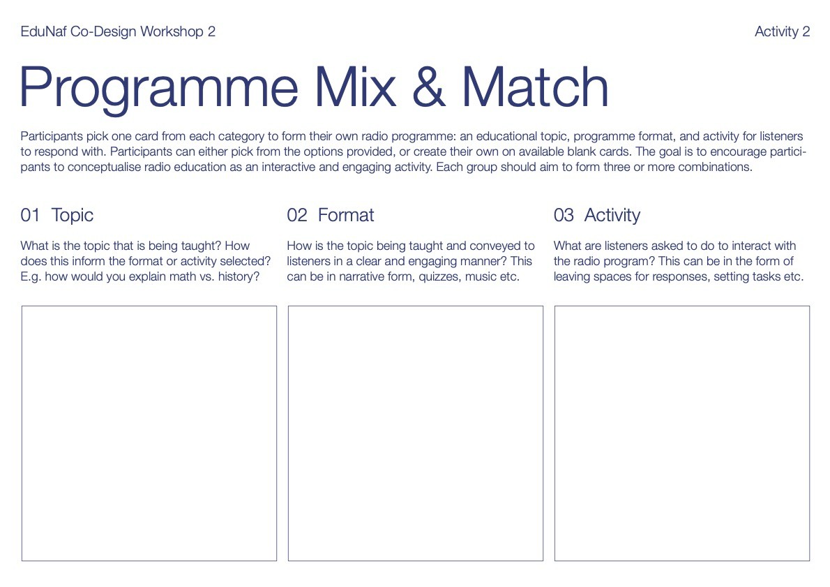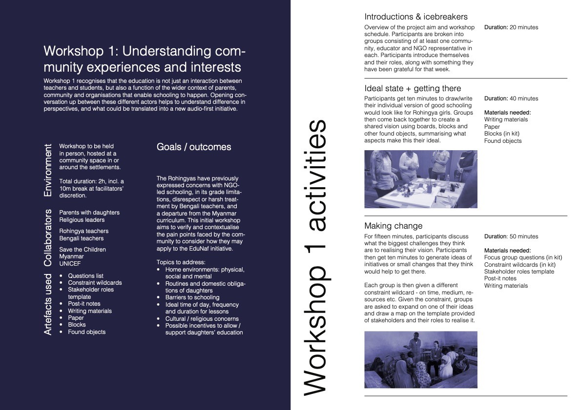 This would follow in a series of three main workshops. Workshop 1 brings together community representatives such as parents and religious leaders to articulate issues surrounding education access for girls Workshop 2 brings together local and nonprofit educators to explore the possibilities of interactive radio instruction in a Rohingya context. Workshop 3 centers on Rohingya girls’ home and educational experience to inform the types of activities and formats that would most engage them.