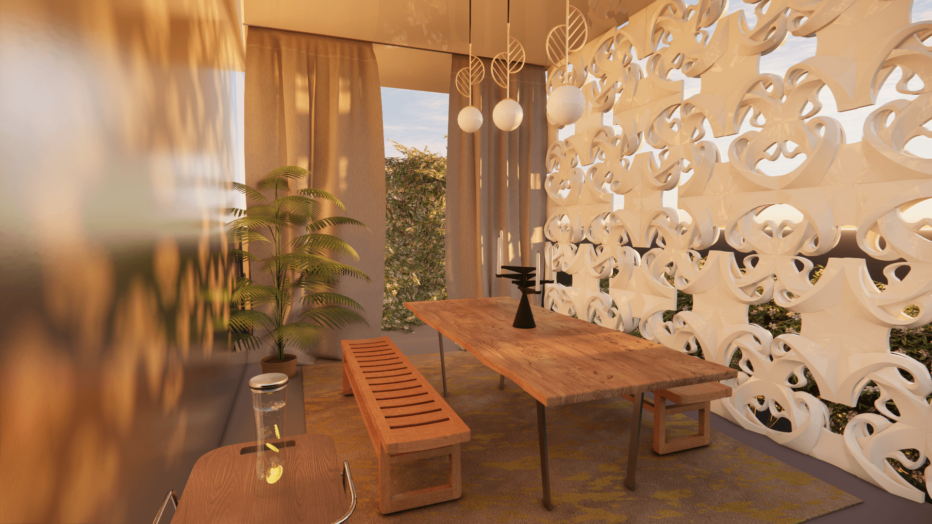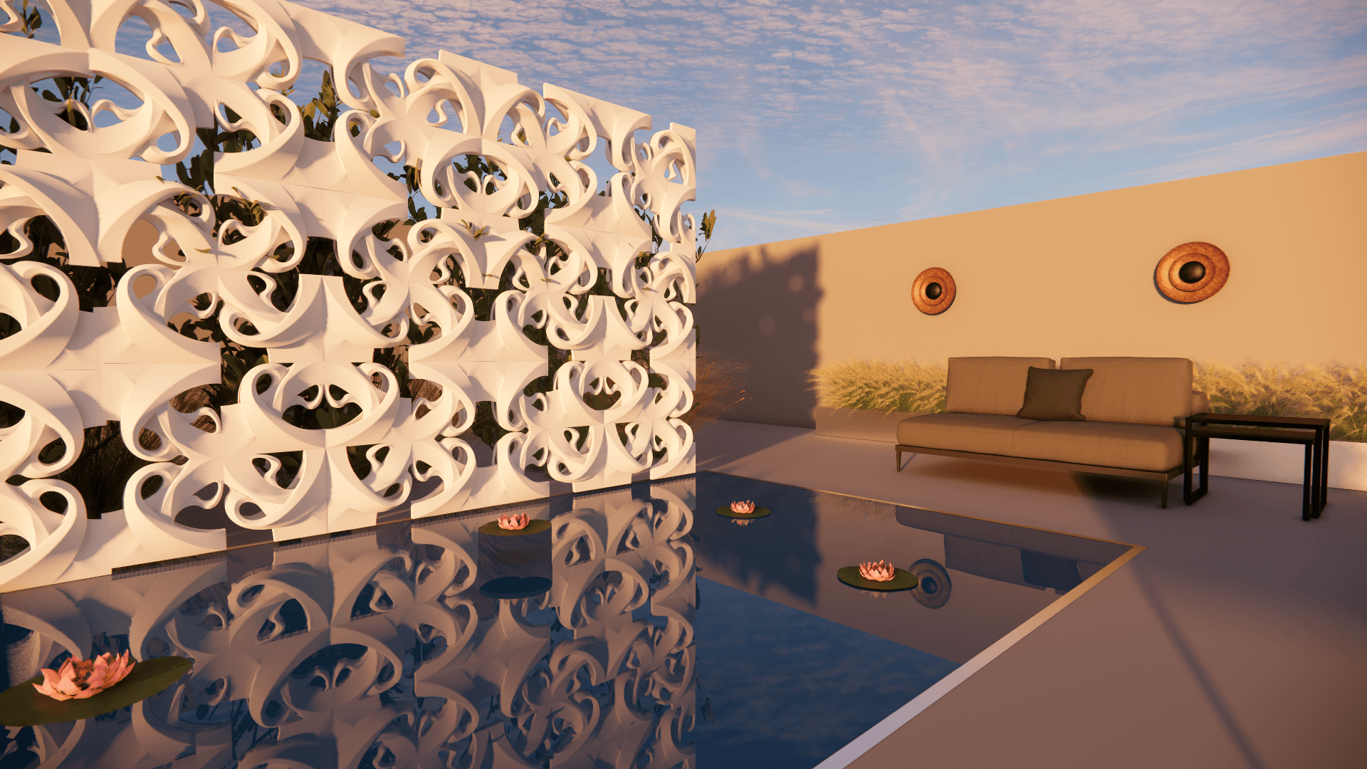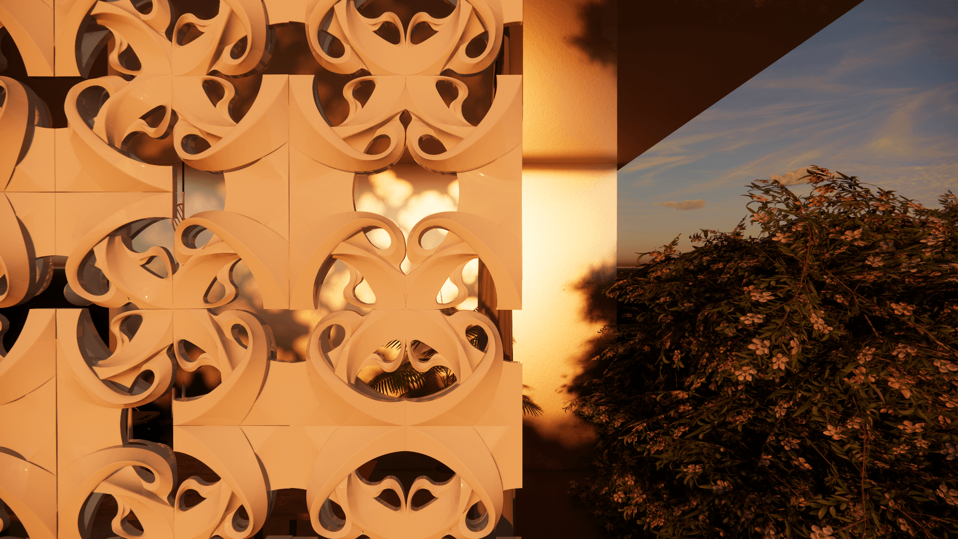 The Flourish breezeblock is inspired by the flows and curves of the Art Nouveau move- ment. Tapping on the tendrils and sweeps that characterise the works of Hector Guimard and Josef Maria Olbrich, it balances organic forms with geometric directionality such that it can be rotated and mirrored to create dynamic ornamanetal patterning. The breezeblock’s gesture follows a Truchet diagonal to offer movement and patterning through different configurations, some of which are shown below.