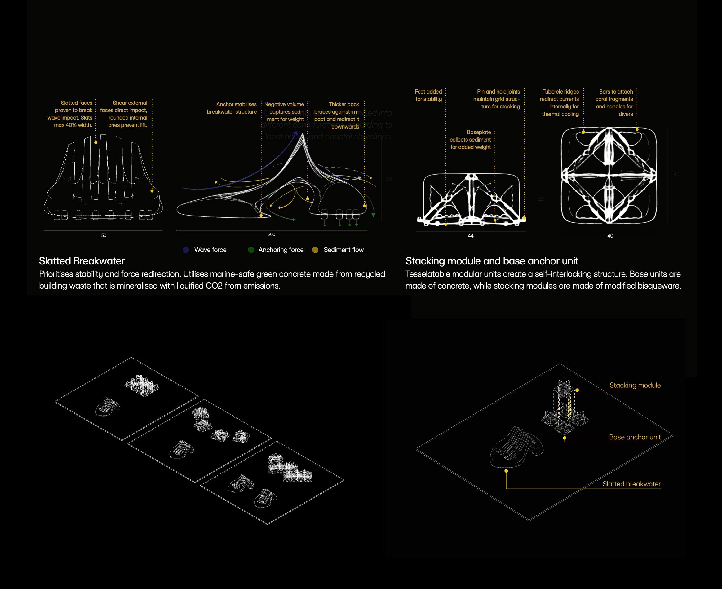 The concept behind the system lies in using its design features and structure to utilise and redirect the wave forces it experiences as ways to keep the system tighter and more anchored. Its modularity allows adaptation into different formations and sizes for different coastal requirements, while also allowing replacement or repair in parts rather than the whole.